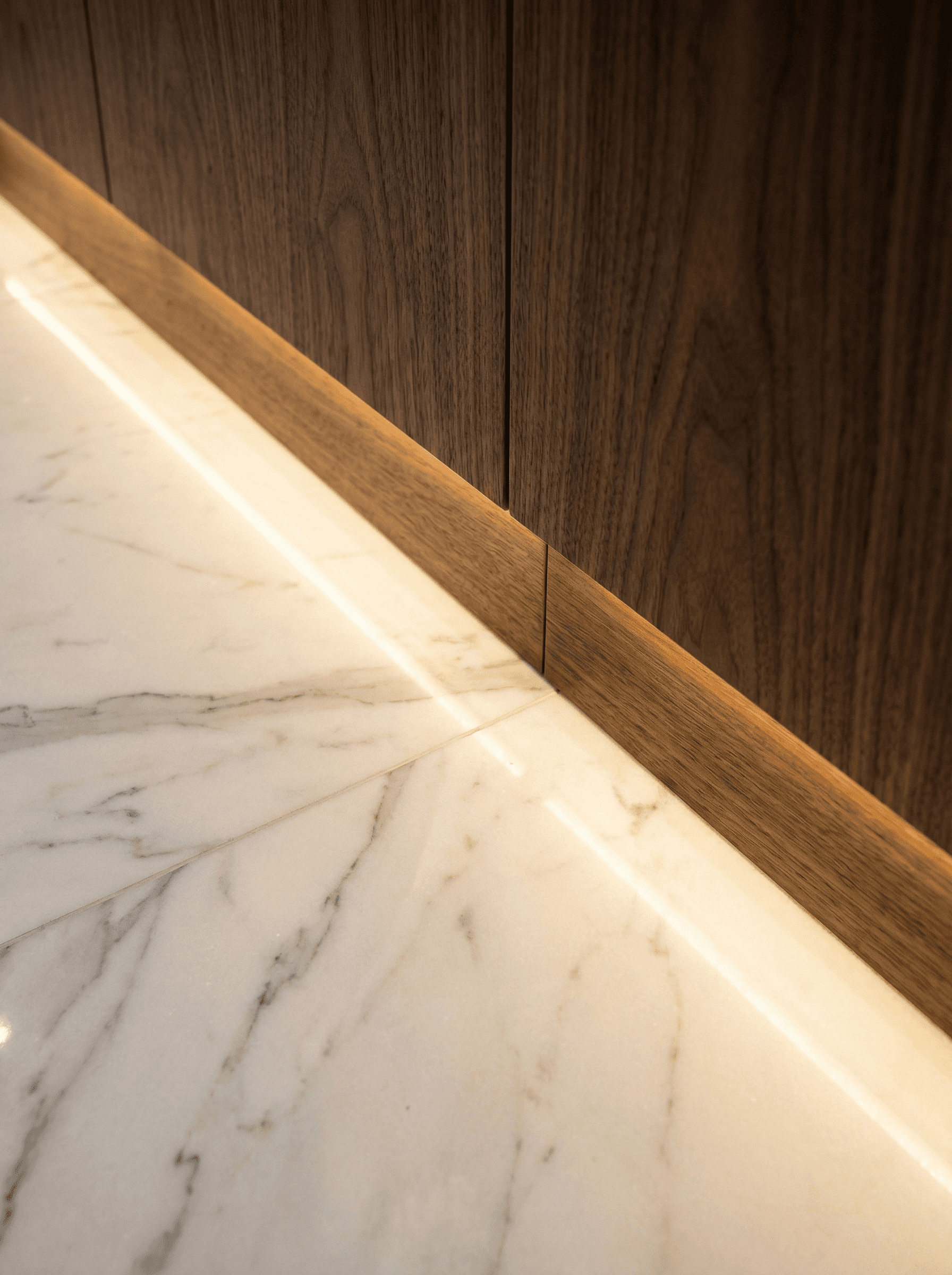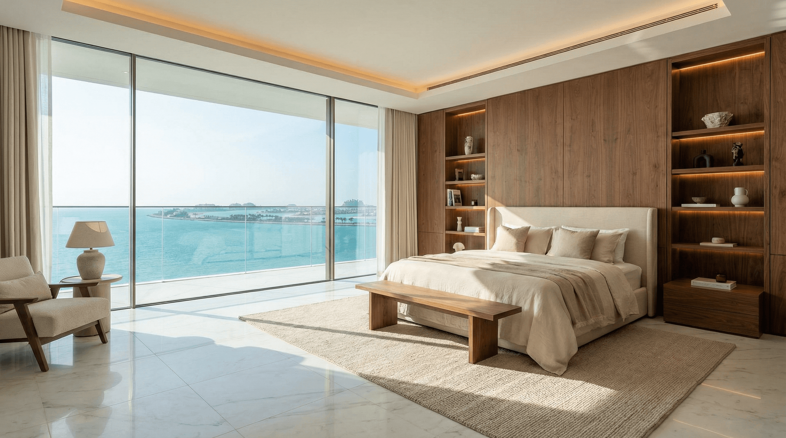 Premium marble flooring, bespoke walnut wall panels, integrated lighting, and custom furniture pieces elevate the residence. Every finish was selected for longevity, elegance, and harmony with the coastal setting.