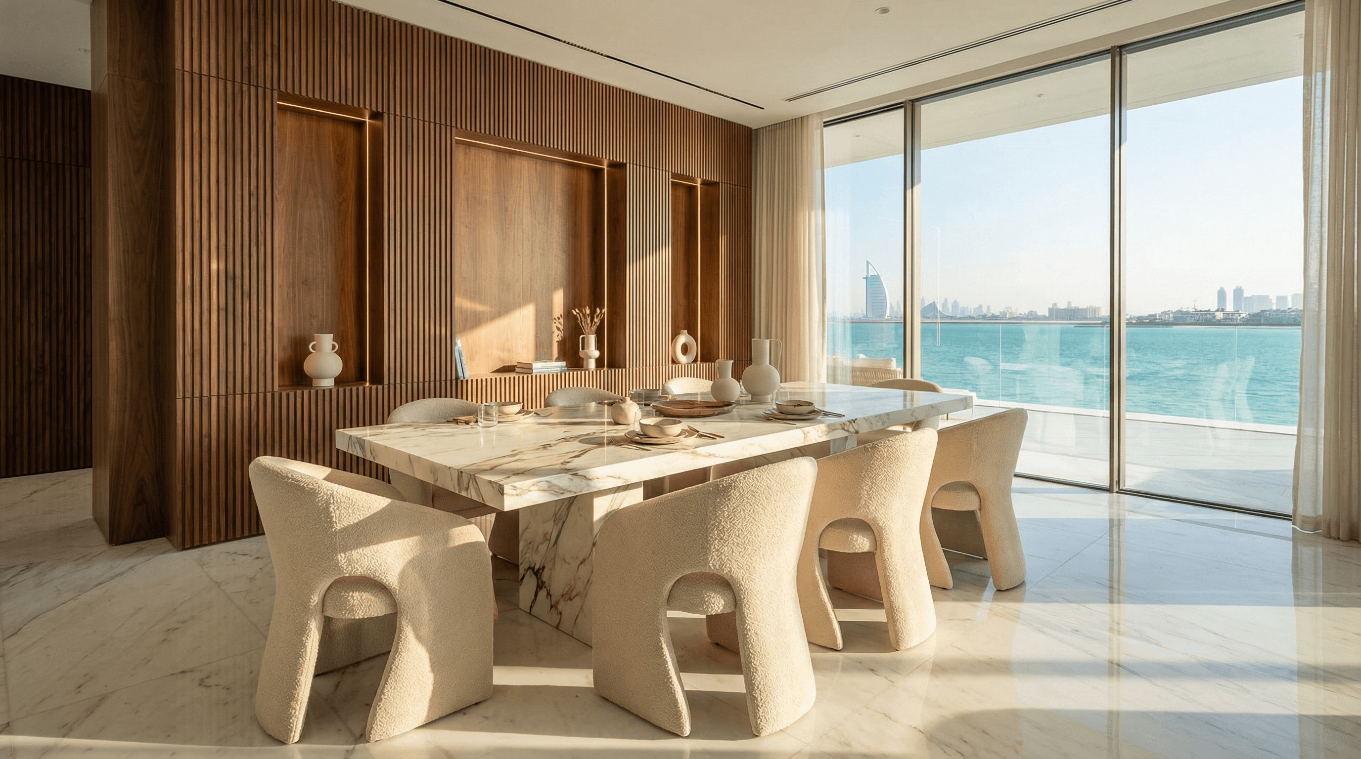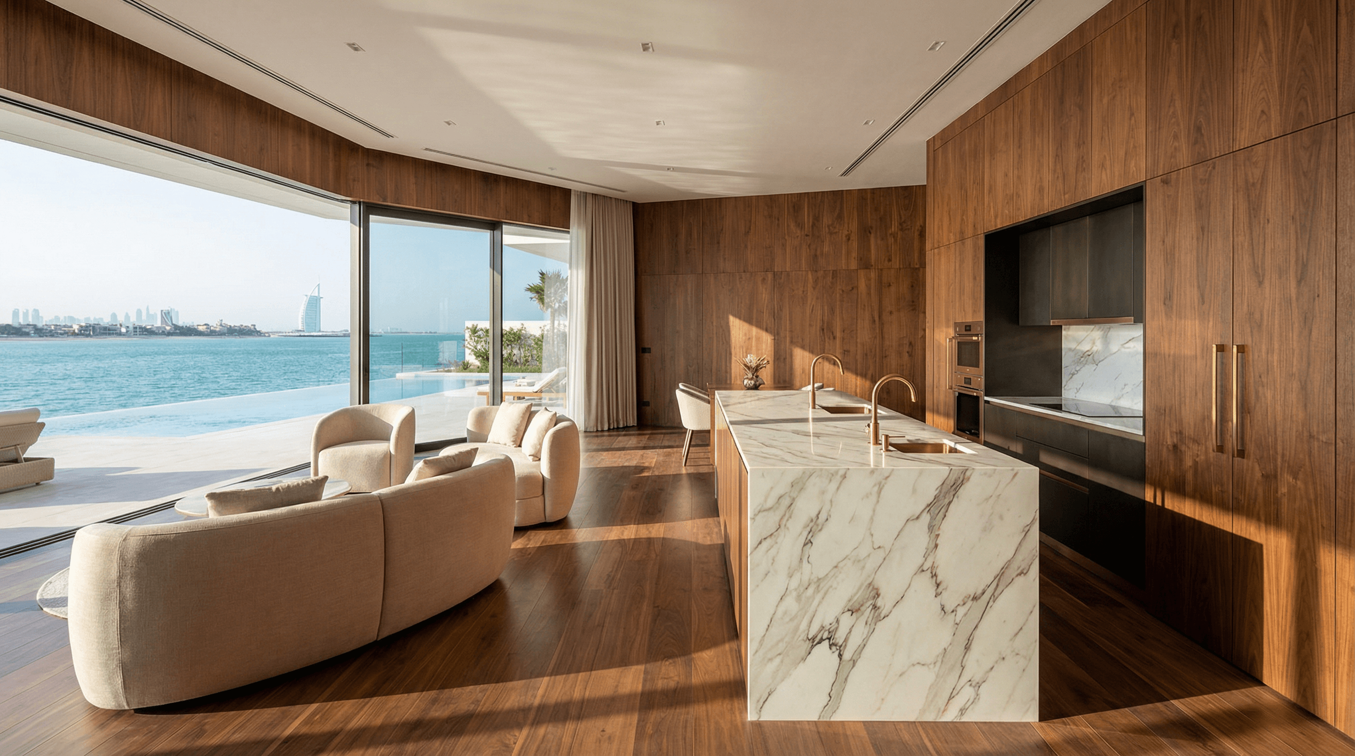 Palm Horizon Residence is a contemporary beachfront villa overlooking the Dubai skyline. Designed with refined marble finishes, warm walnut paneling, and panoramic glazing, the home balances bold architectural presence with understated luxury. The space was crafted to maximize sea views, natural light, and seamless indoor–outdoor living.